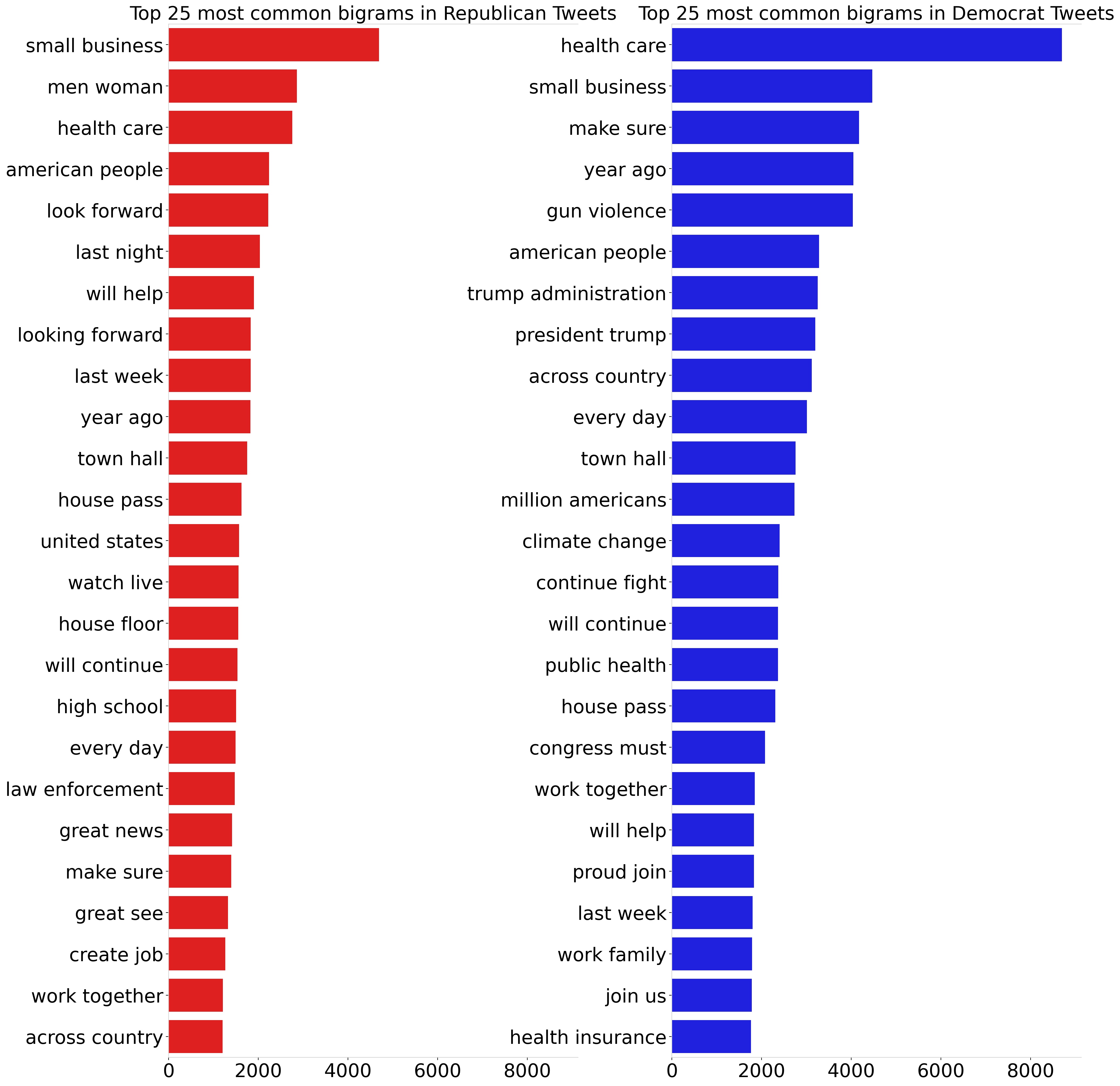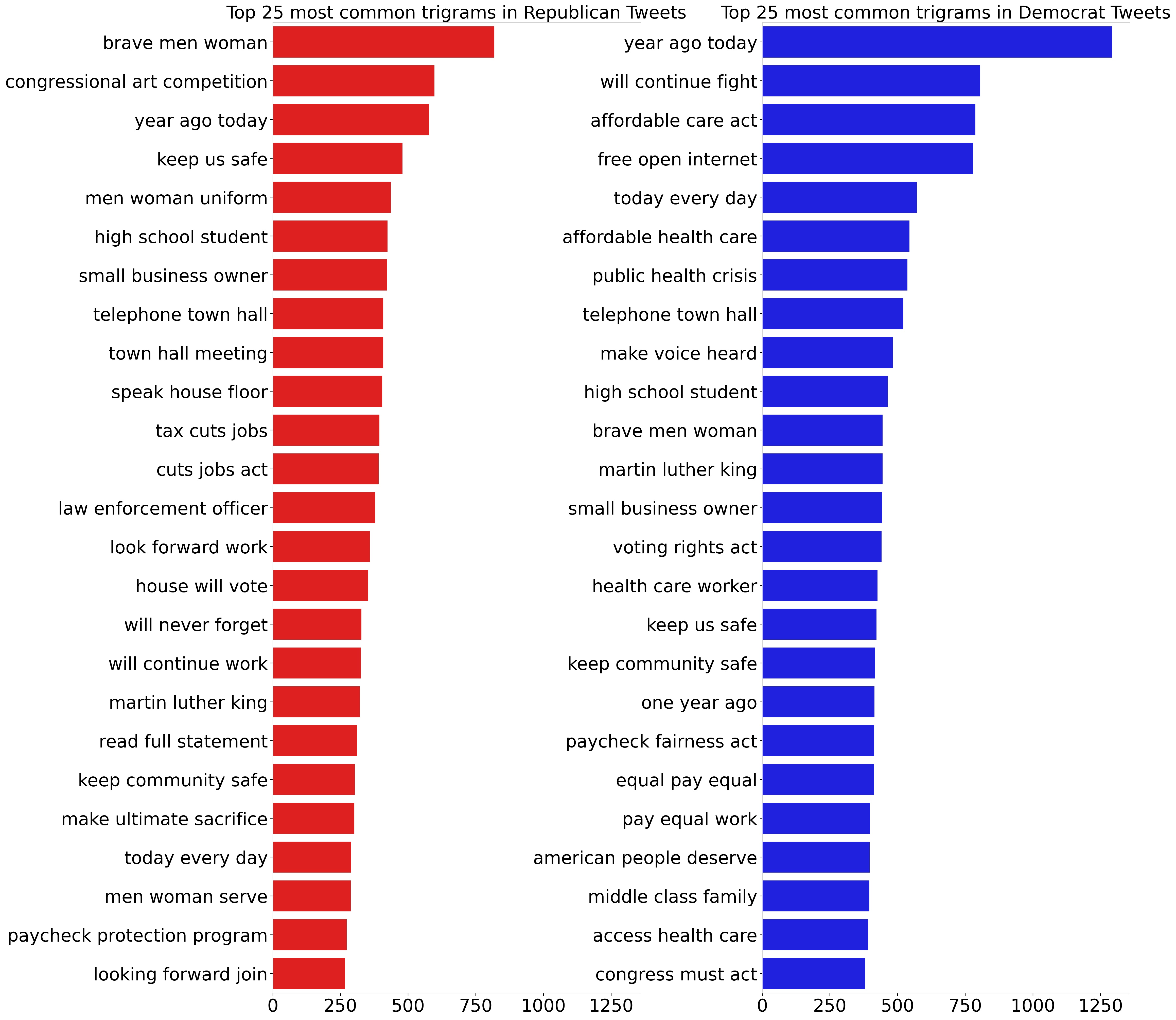 As mentioned before, Fig. [fig:top10hashtags] shows shared usage of certain hashtags such as “COVID19.” To understand usage of certain words in context, ngrams can be very useful. As a result the top 25 bigrams and trigrams by party were also found and are summarized in Fig. [fig:bigrams] and [fig:trigrams].