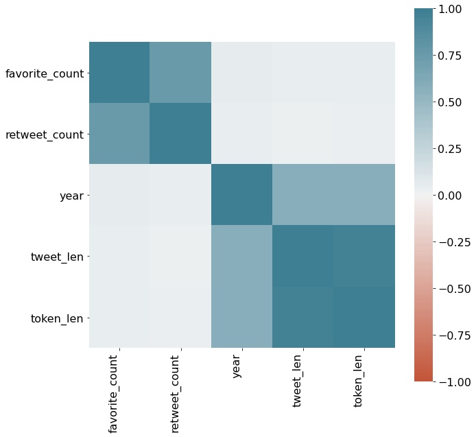 Finally, to understand whether there is a correlation between all the numerical data, a correlation matrix is constructed as shown in Fig [fig:corr]. The correlation matrix does show the trends we expect it to show as we have observed in all the other figures. Additionally it also shows that there is a positive correlation between the length of the raw tweets as well as the cleaned tweets over the years.