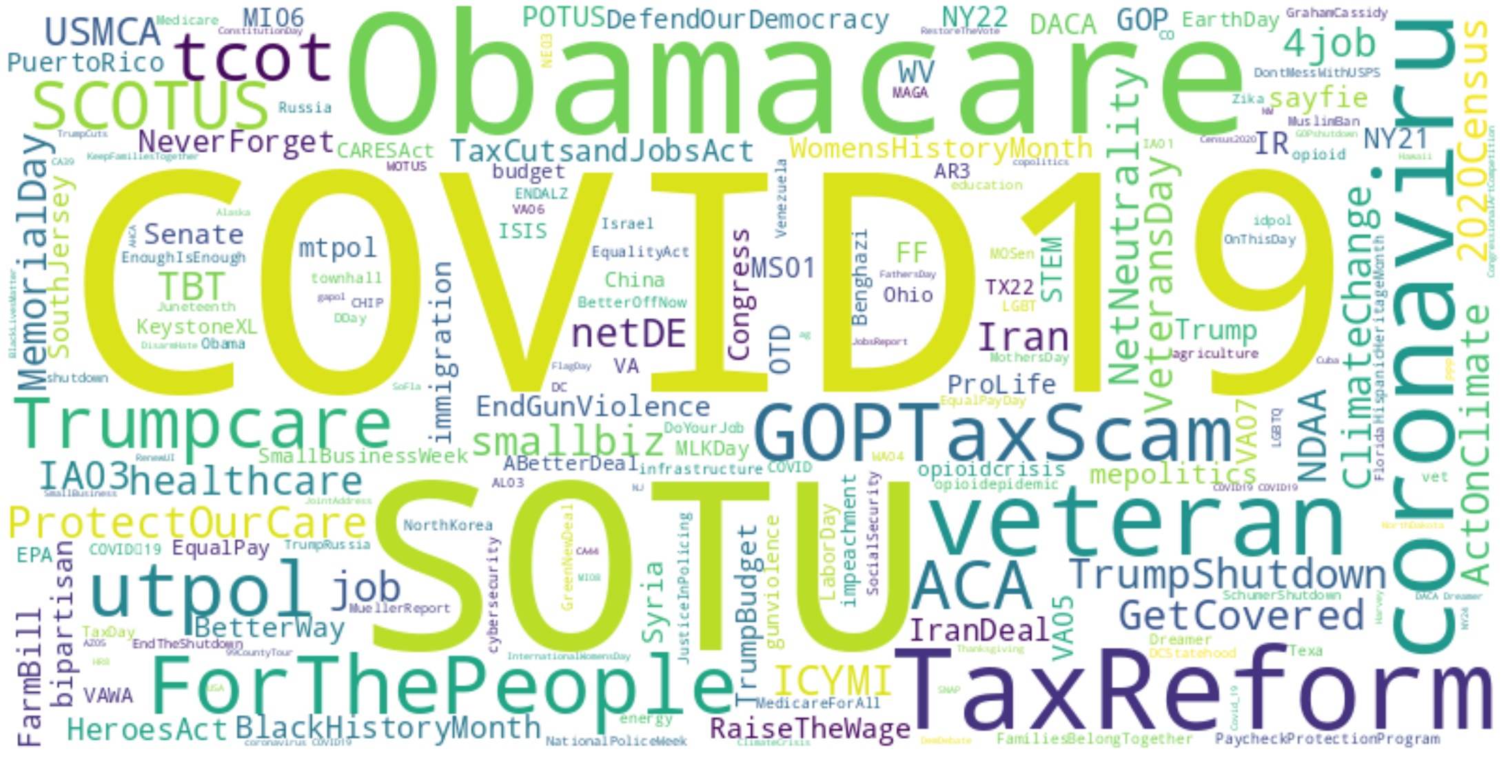 One of the main components that sets twitter apart from other social media are the hashtags. Some of the most used hashtags are visualized in Fig [fig:hashcloud].