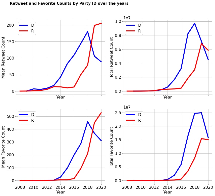 Just like the distribution, the temporal behavior also shows a more imbalanced distribution of retweets and favorites for the democrats in terms of total as well as mean. However, in the recent few years, Republicans do seem to have much higher mean retweets and favorite counts.