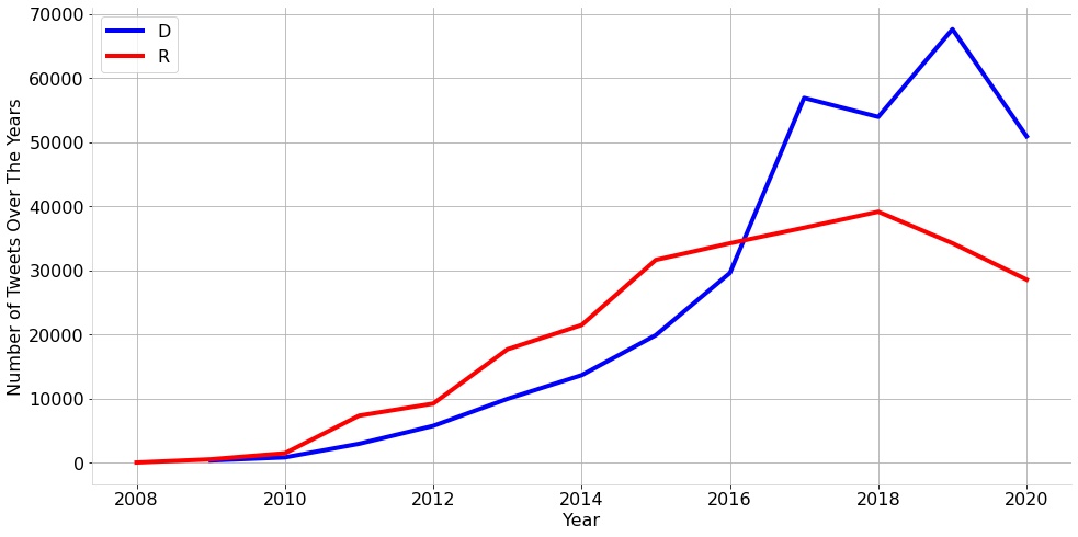 In terms of interactions it can also be useful to understand the total number of tweets over the years by party to understand which party has been more active on Twitter over the years. Fig. [fig:tempNum] shows that over the years the number of Democratic tweets have risen while the number of Republican tweets have fallen.