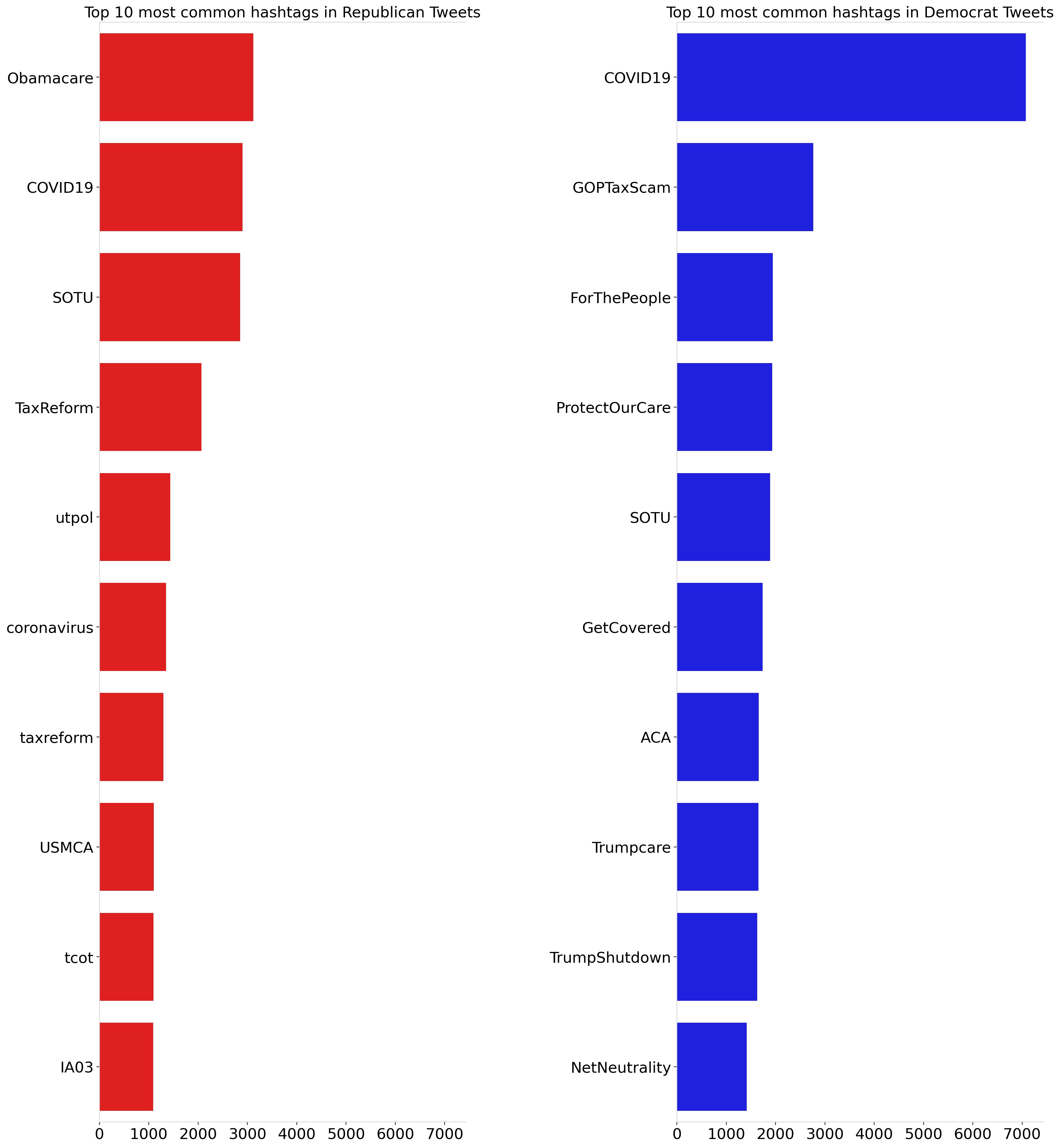The exploration of hashtags by party might reveal some patterns in the tweets themselves as a result barplot of the 10 most used hashtags is generated. While there are some similarities in the hashtags that are present for both parties, the frequencies vary vastly as can be seen in Fig [fig:top10hashtags]