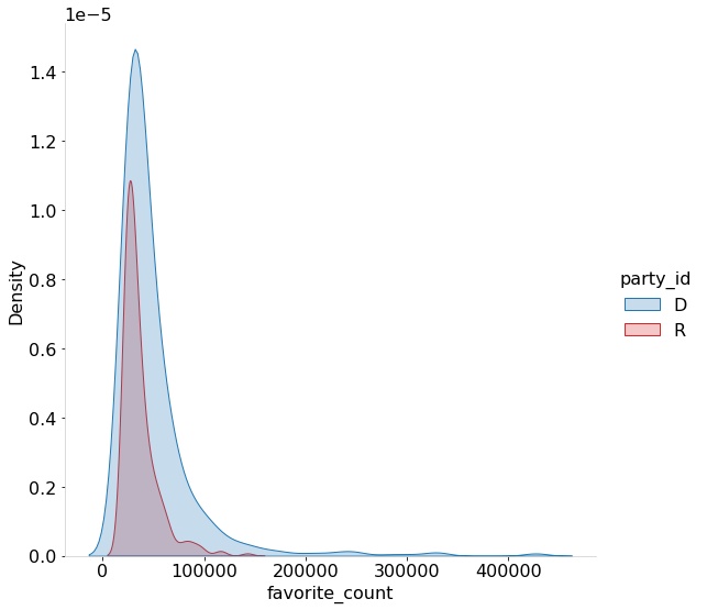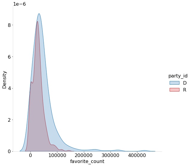 Another feature specific to social media and Twitter are the favorite (or likes) and retweets (or shares) features. Such activities allow the tracing of interactions between users and their networks. Understanding how a tweet “performs” can allow better understanding of the interactions of users of the same political party with users within the party. As a result, the distribution of the top 1000 retweets and favorites by party are generated. Fig [fig:topfavs] and [fig:toprts] show how many of the top interactions were by republicans vs how many were by democrats.